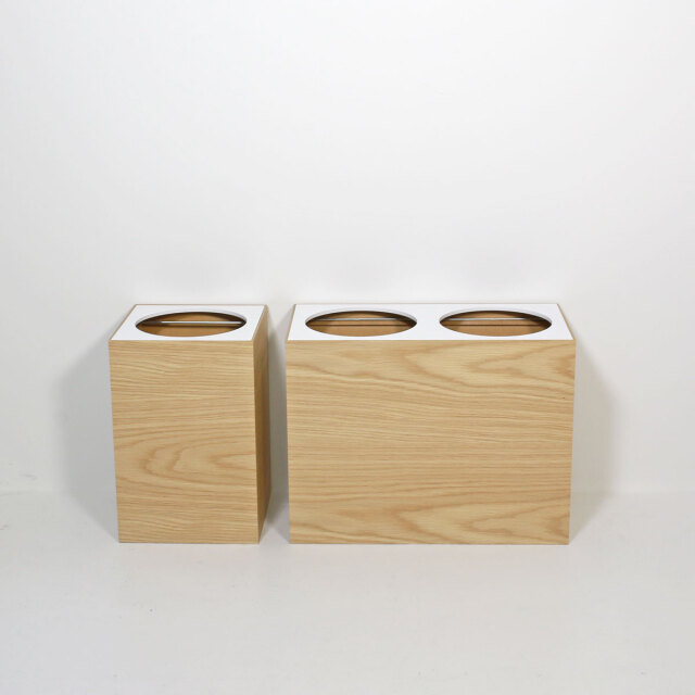 ビニール袋が外から見えないゴミ箱の分別タイプ。ちょっとした隙間にも入りこむスマートなサイズと2分別できる使い勝手の良さが人気。エコ素材のMDFにオークの突板を張った家具のような存在感がナチュラルなインテリアに馴染みます。客室で使われているホテル仕様ですがオフィスでもお使いいただけます。